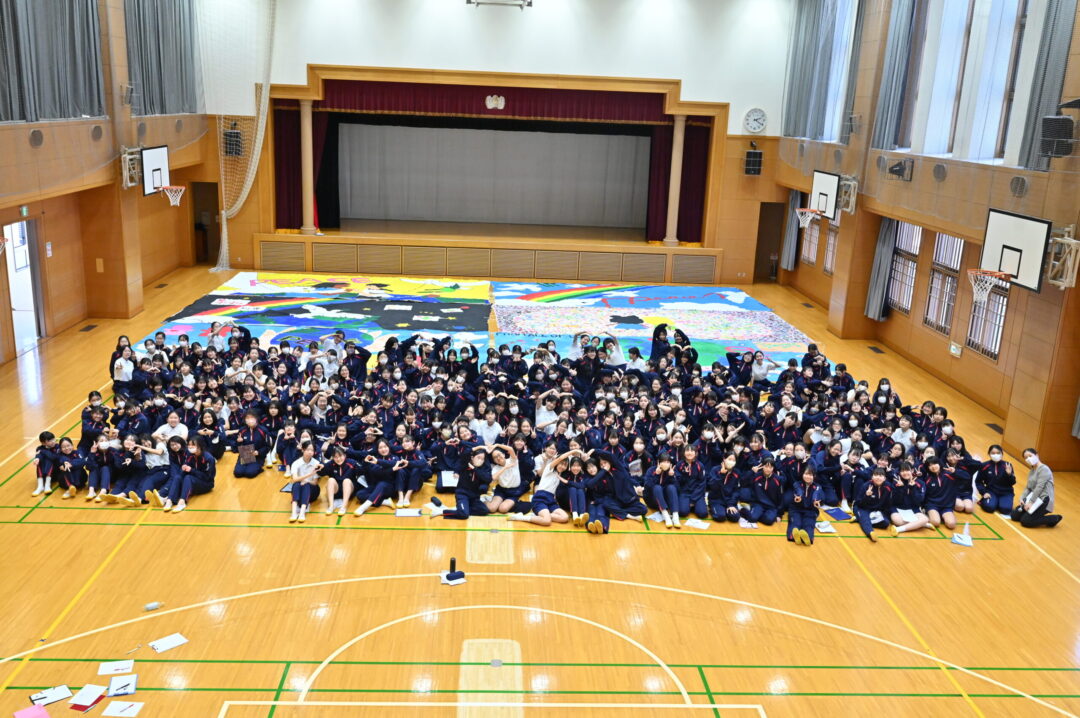 事前に美術の授業で図案を考え、当日は6階体育館に学年全員が集合し、ピカソの「ゲルニカ」と同じ大きさの7.8×3.5mのキャンバスに絵の具で着色しました。完成後は作品をステージに吊り下げ、ゲルニカ委員による作品解説から鑑賞が始まりました。その解説を通して、平和の捉え方やデザインへの表し方がクラスごとに異なっていることに気づき、その違いの興味深さを共有しながら、互いの努力を称え合い、作品を味わいました。